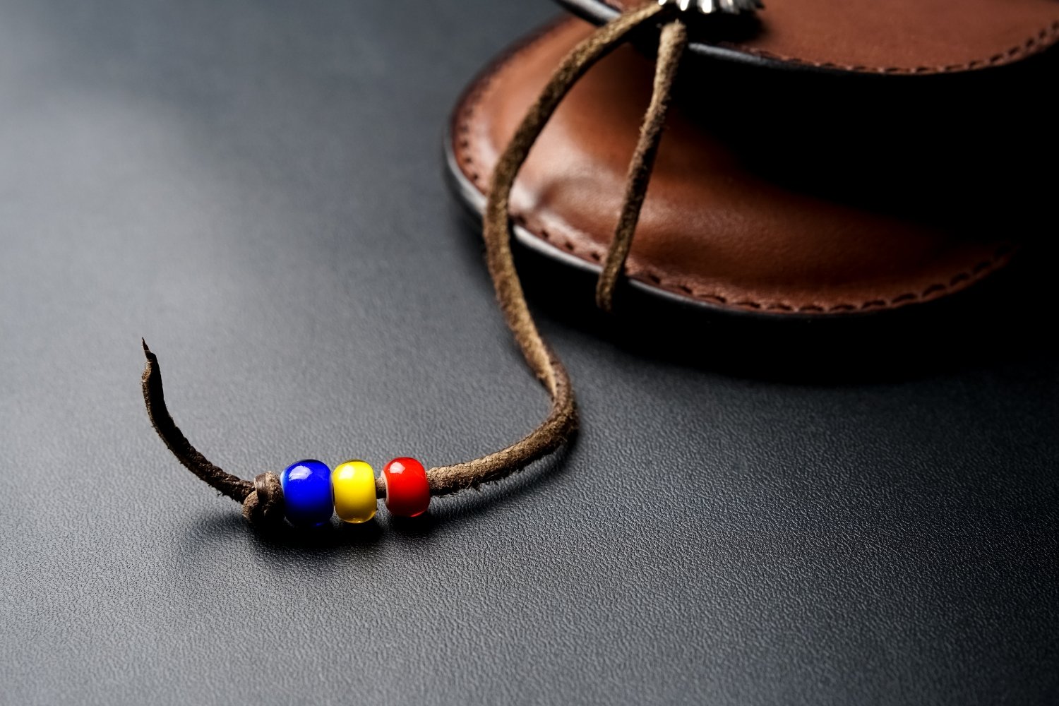 フラップは革紐を巻いて留めるクラシックなスタイル。このひと手間が大人の余裕と美しい所作を演出します。革紐には柔軟性がありながら伸びにくいディアスキンを採用し、遊び心のある色違いのヴィンテージビーズをあしらいました。