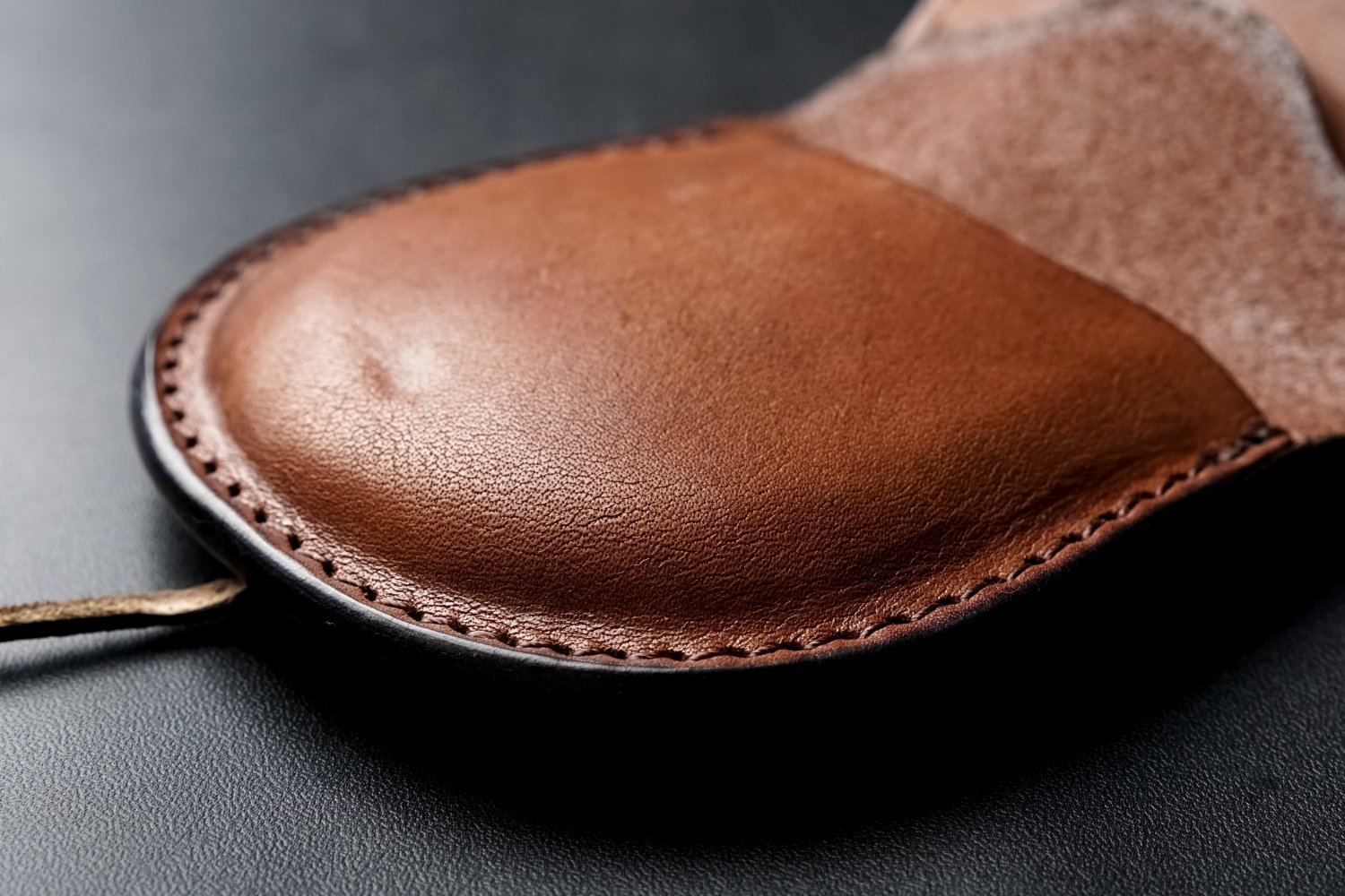 堅牢性が求められる素材には、伝統的なピット層でタンニン鞣しを行う数少ないタンナー、昭南皮革工業所によるサドルレザーを採用。独自ブレンドのオイルを多分に含み堅牢でありながらもしなやかさを併せ持つ、国内最高峰のヌメ革のひとつです。