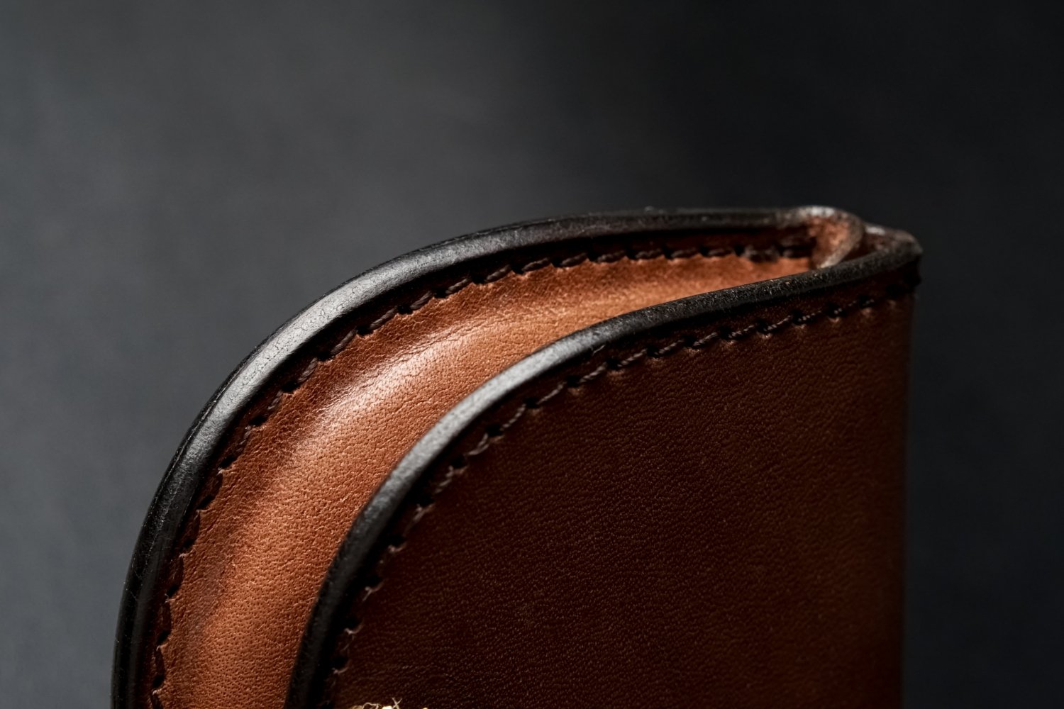 コバと呼ばれる革の裁断面はエッジを立てず丁寧に面取りを施しました。手に馴染みやすいように研磨を重ね滑らかな丸みを持たせています。