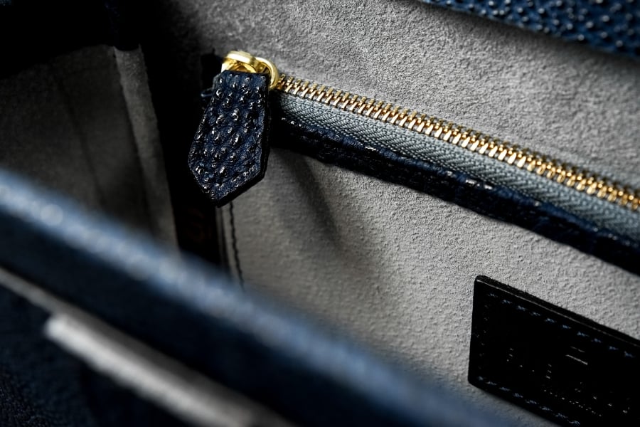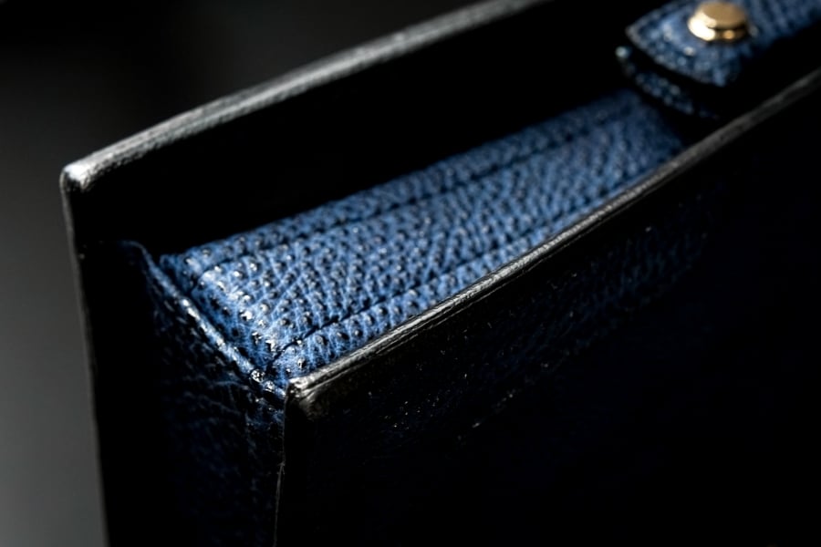 柔らかく強度も備えるため古くから靴の内装などにも用いられてきたピッグスエードを、内装全面に使用。本体と同じ黒桟革を丁寧にトリミングし、耐久性に優れる総革仕立てとしました。