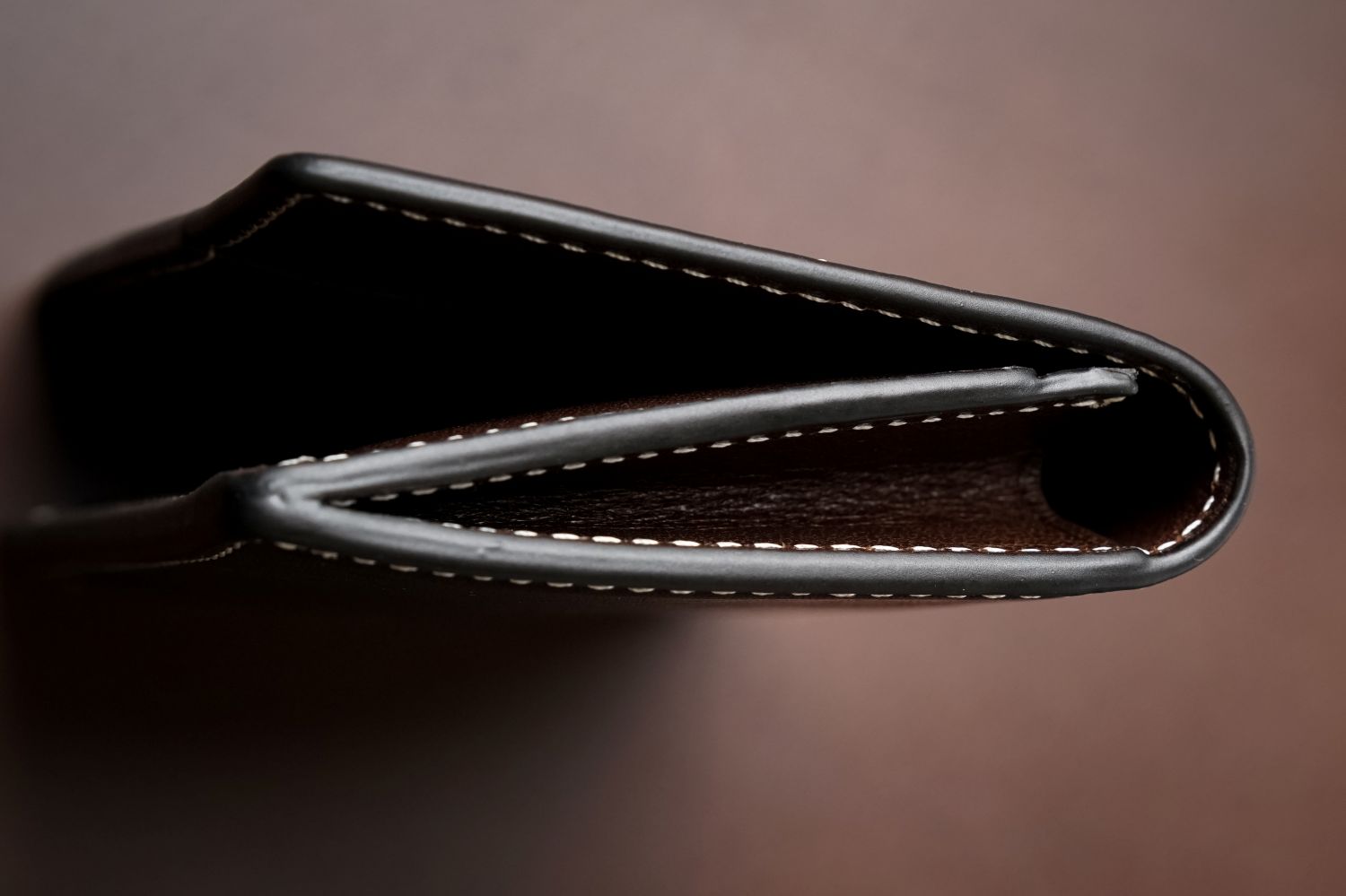コバと呼ばれる革の裁断面は、何層にも重なる革が平らになるまで念入りに磨き上げてから、特製の樹脂を複数回に分けて塗り込み滑らかに仕上げています。手間のかかる製法ですが、これにより型崩れしにくく耐久性の高い製品となるのです。マチ部分はササマチと呼ばれる底が狭くなる仕様で、厚みを抑えながら必要十分な収納力を両立しています。