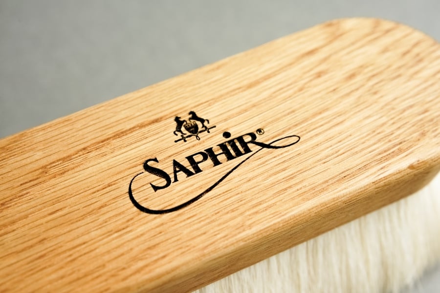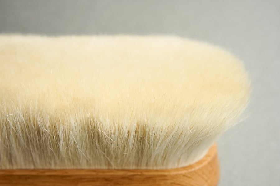 広島県安芸郡熊野町で伝統的技法により手作りされる「熊野筆」。毛の穂先を切り揃えずに繊細な細さを活かした独自製法が優しく心地よい柔らかさを生み出します。この伝統製法を以て圧倒的な毛量と密度で手植えされた山羊毛と馬毛の混毛は、柔らかさの中にもコシがあり革製品のケアや鏡面磨きなどに最適化されています。
