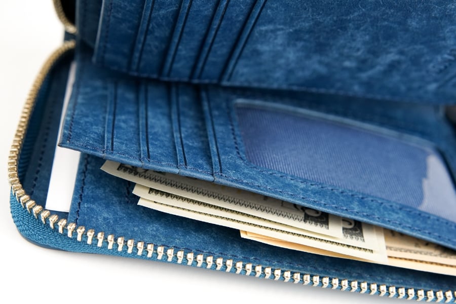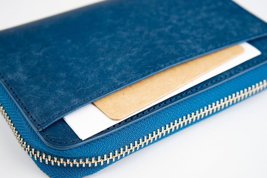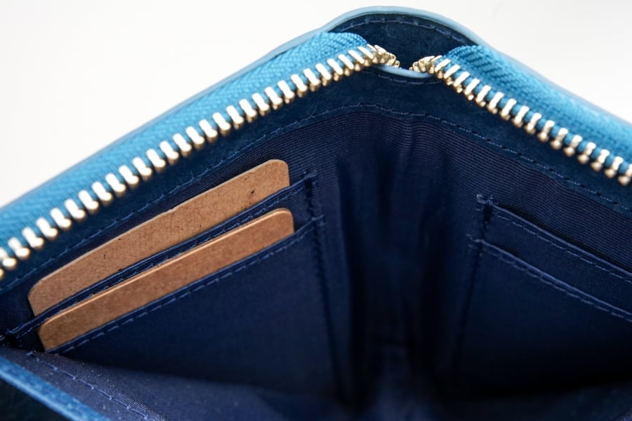 2層式札入れの手前側は左端を縫い付けないオープン仕様。お札をさっと取り出しやすく設計しています。