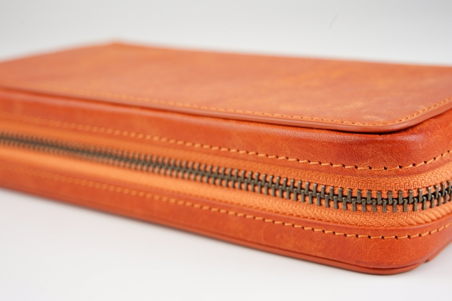 ナチュラルなベジタブルタンニン鞣しの牛革を使用。表面を特殊な工具で細かく削り独特の表情を醸し出しています。使うほどに色艶が増し経年変化が愉しめます。