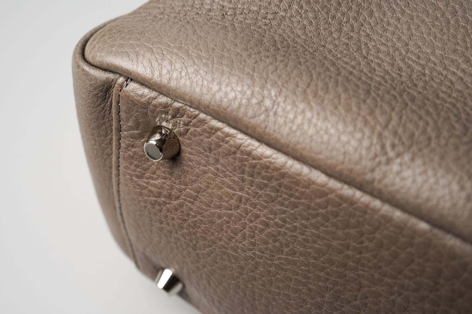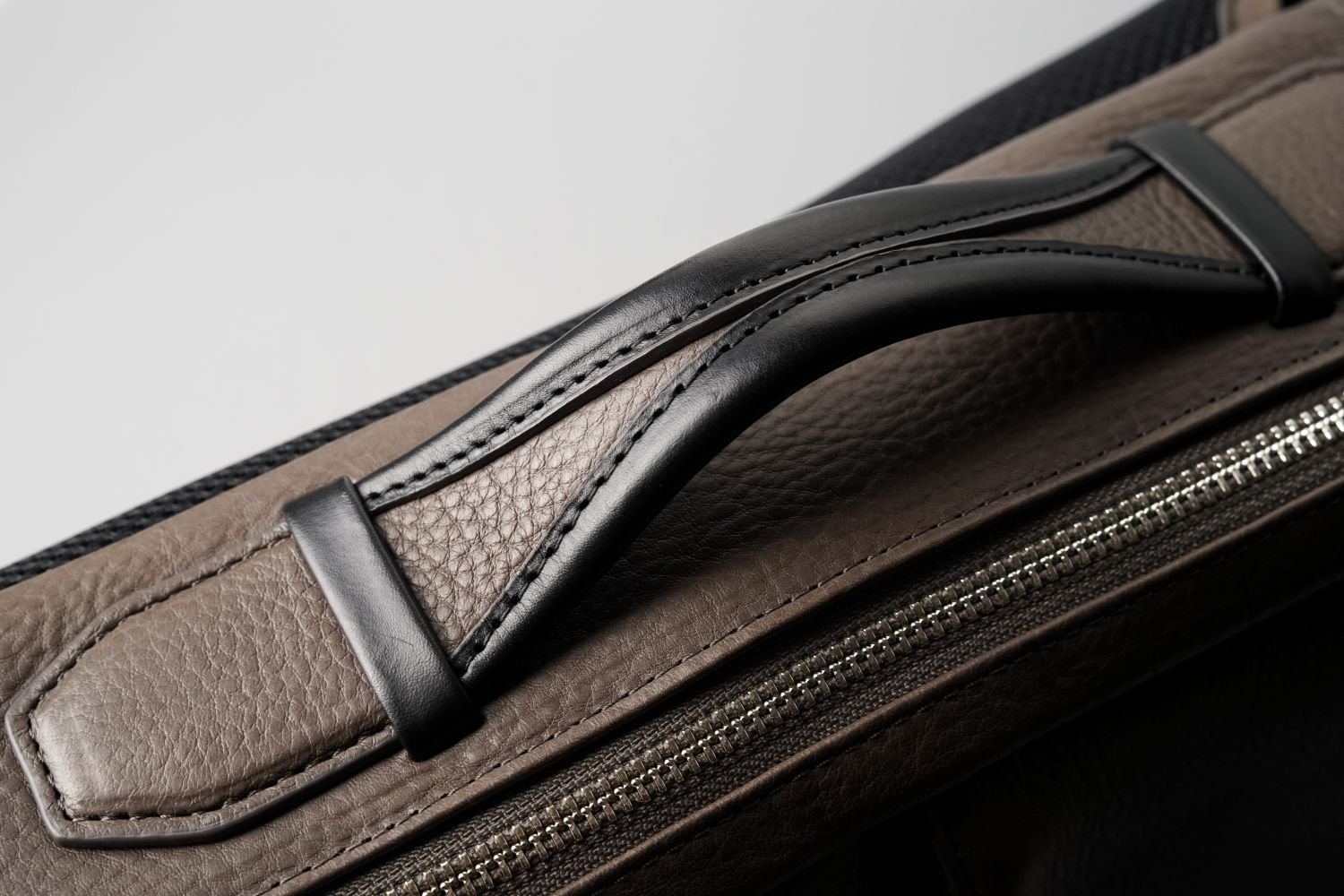 柔らかな本体革を堅牢なヌメ革で包み込んだデザイン。快適で疲れにくい握り心地と耐久性を兼ね備えています。縦横どちらでも持てるよう、上面と側面の2か所に装備しています。