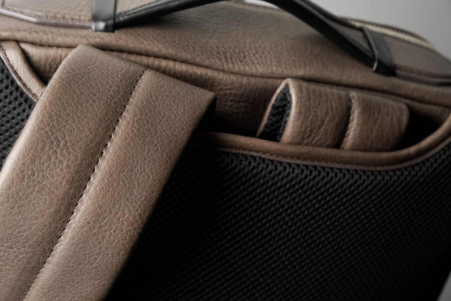 S字パターンと袋縫い仕立てで柔らかく肩に馴染み、撫で肩でも外側に滑り落ちにくい仕様です。上質なレザー仕立てで高級感を演出しながら、裏面にはメッシュ素材を配し通気性を向上させています。使用しないときは背面ポケットに収納できます。