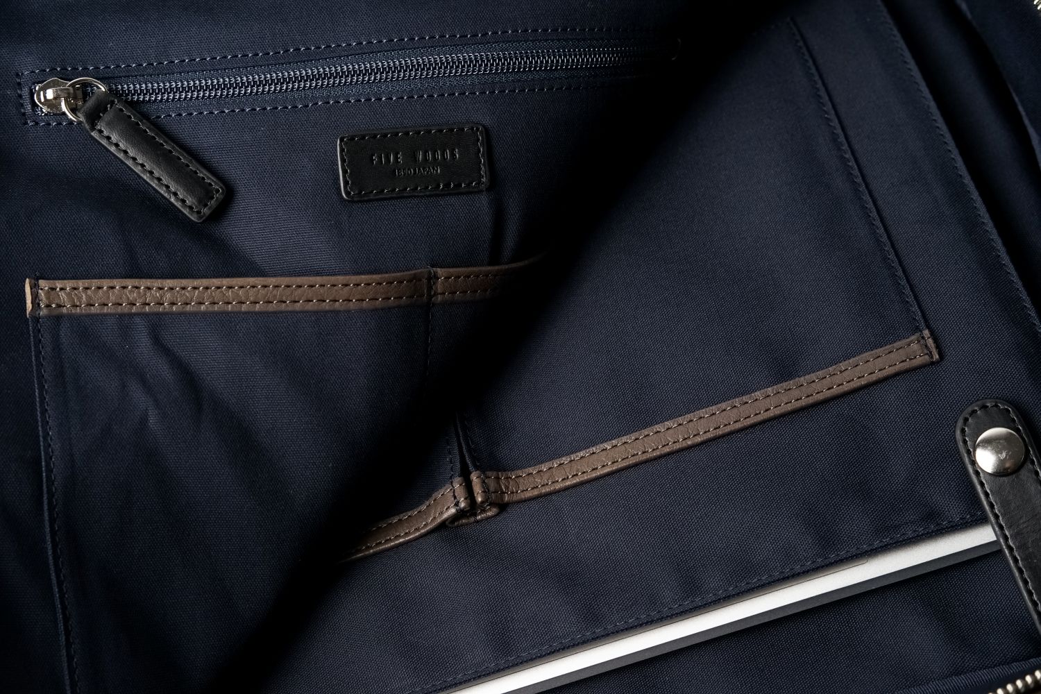 A4ファイルが余裕を持って収納できる内装。縦向き、横向きの両方で対応できるよう、向きが異なるポケットを組み合わせています。クッション性のあるPCスリーブには13インチのラップトップが余裕で収納可能。スナップボタンを閉めなければ15インチまで対応できます。