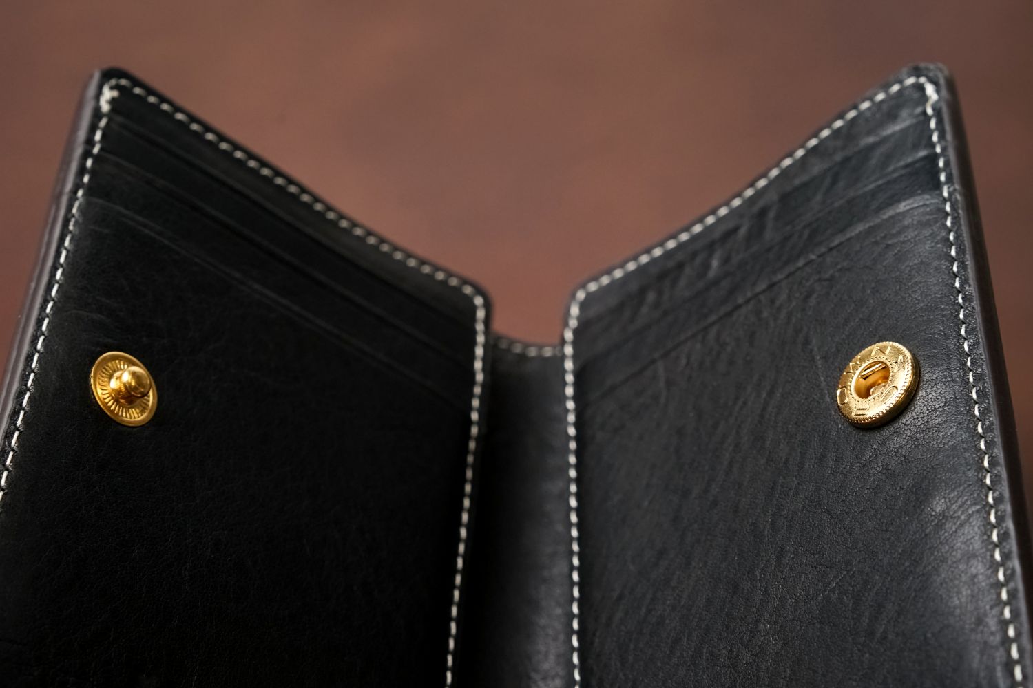財布が不用意に開いたり嵩張ったりするのを防ぐスナップボタンを装備しています。