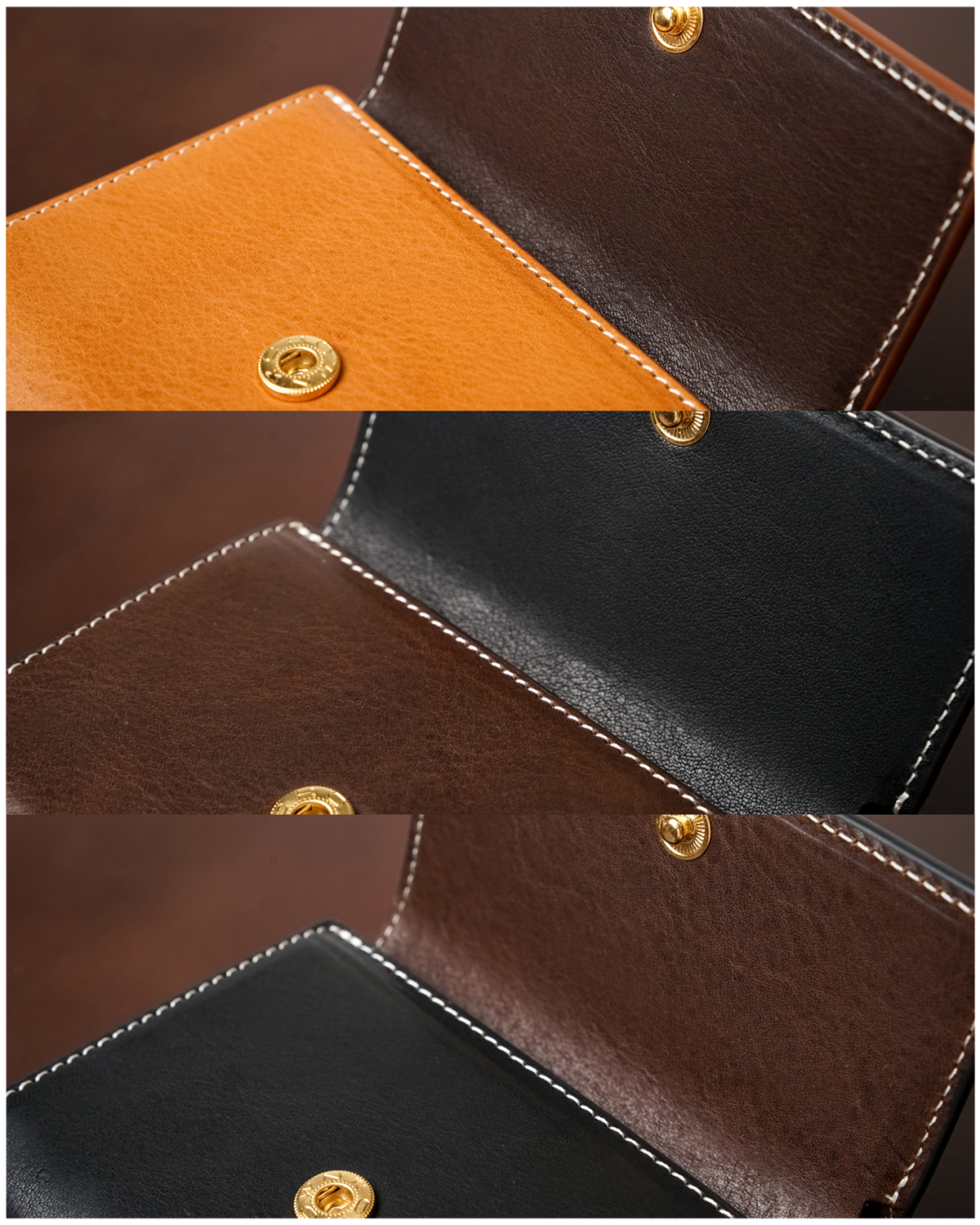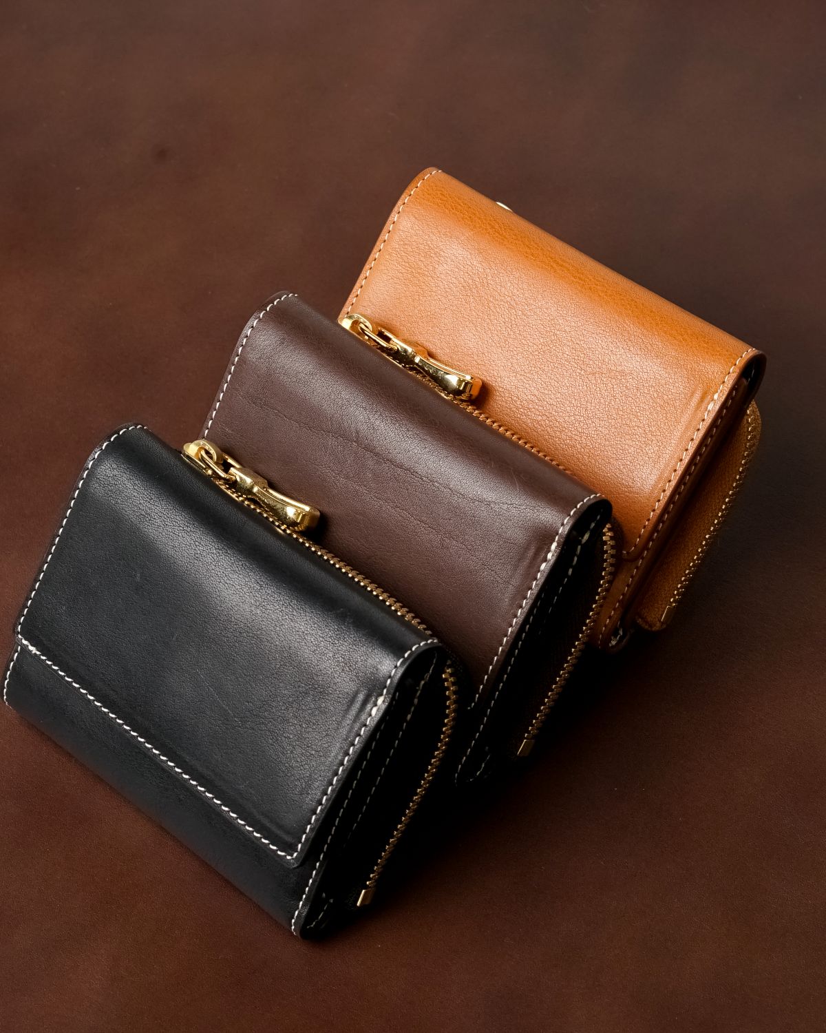素材の風合いを活かした3色のカラーバリエーションを用意しました。使うほどに深く黒光りするブラック、重厚感と温かみを湛えるダークブラウン、最も変化の幅が広く育て甲斐のあるキャメル。それぞれ年月とともに美しいエイジングを見せてくれます。